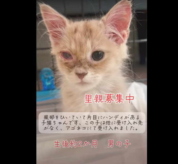 里親の訳→風邪の症状や片目にハンディがあります。