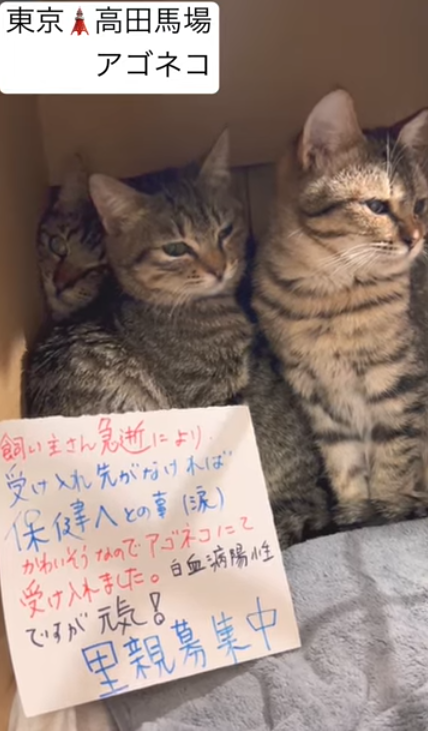 里親の訳→飼い主様急逝の為、行き場のない子達です。受け入れ先がない場合には保健所へとの事で、とっても可哀想な為緊急レスキューしました。動画にも記載しておりますが白血病陽性です。多くの方に知っていただく事でこの子達が幸せになれる場合もございます。シェアお願いいたします。 アゴネコⅩ ↓